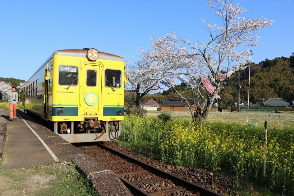 - 上総大久保駅周辺:春は桜+菜の花+赤いディーゼルカーの“三重奏”。