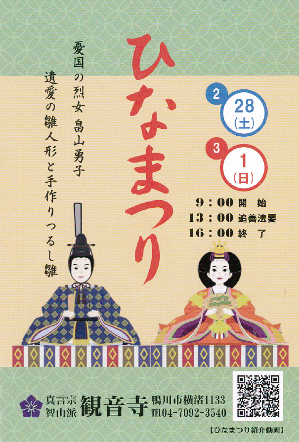 | 観音寺のひなまつり | 鴨川市 | 2/28(土) 〜 3/1(日) | JR安房鴨川駅より徒歩約5分。 | 駅から徒歩すぐの好アクセス。2日間だけの公開となる、貴重な特別展示。 |