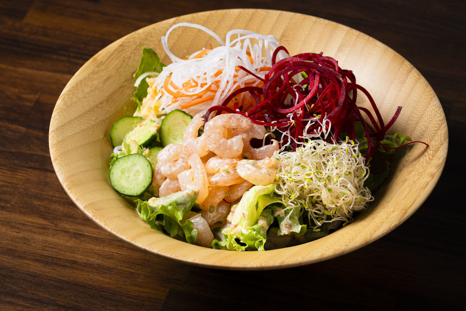 プリプリ食感が嬉しい「小エビのミックスサラダ」は、軽やかに楽しめる人気メニューです。