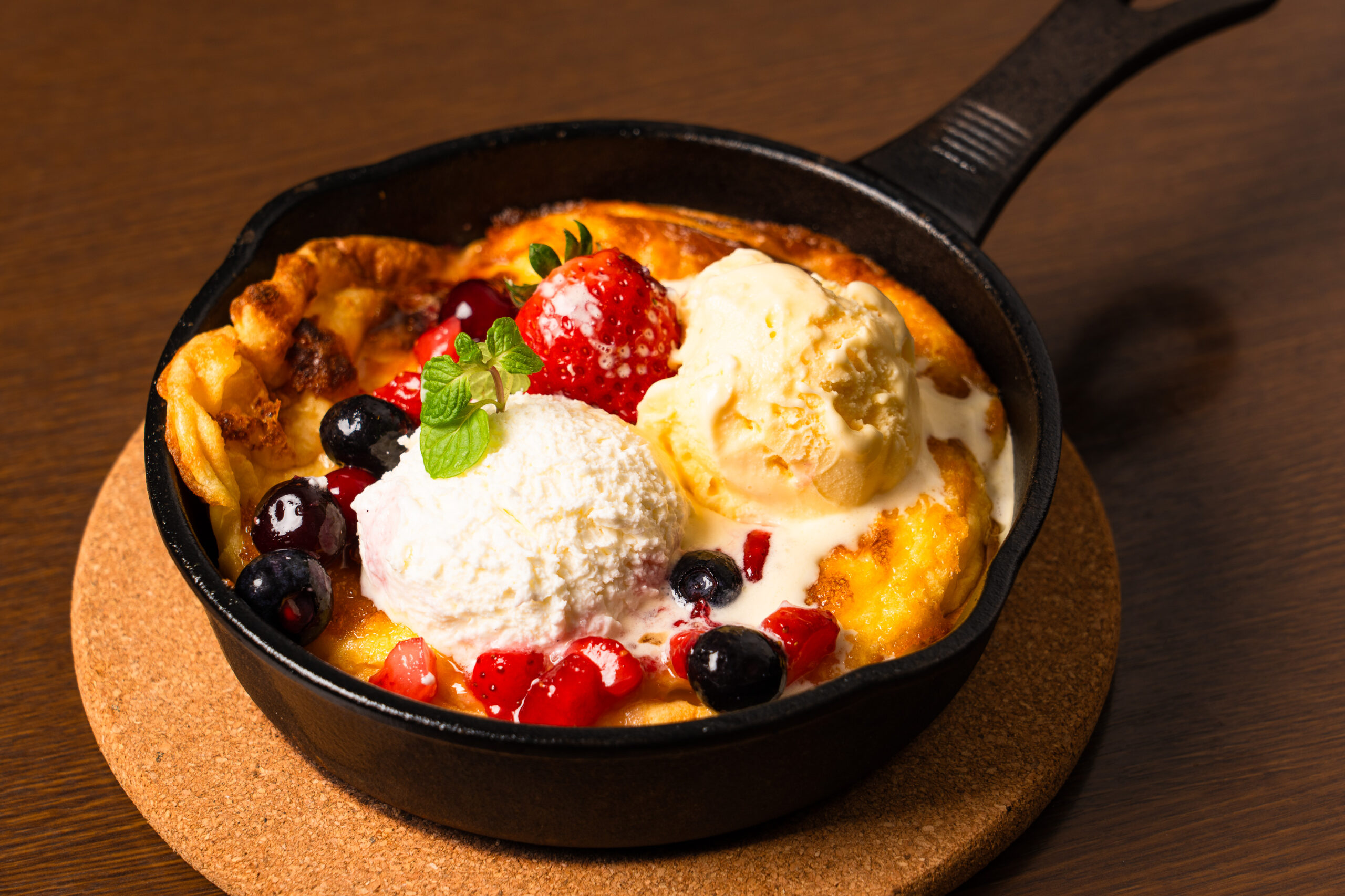 また、見た目も華やかな「ダッチベイビー ベリーレアチーズ」は、ふわふわ生地にベリーの酸味とレアチーズのまろやかさが絶妙に調和し、まるでデザートの実験室のような楽しさを感じられます。