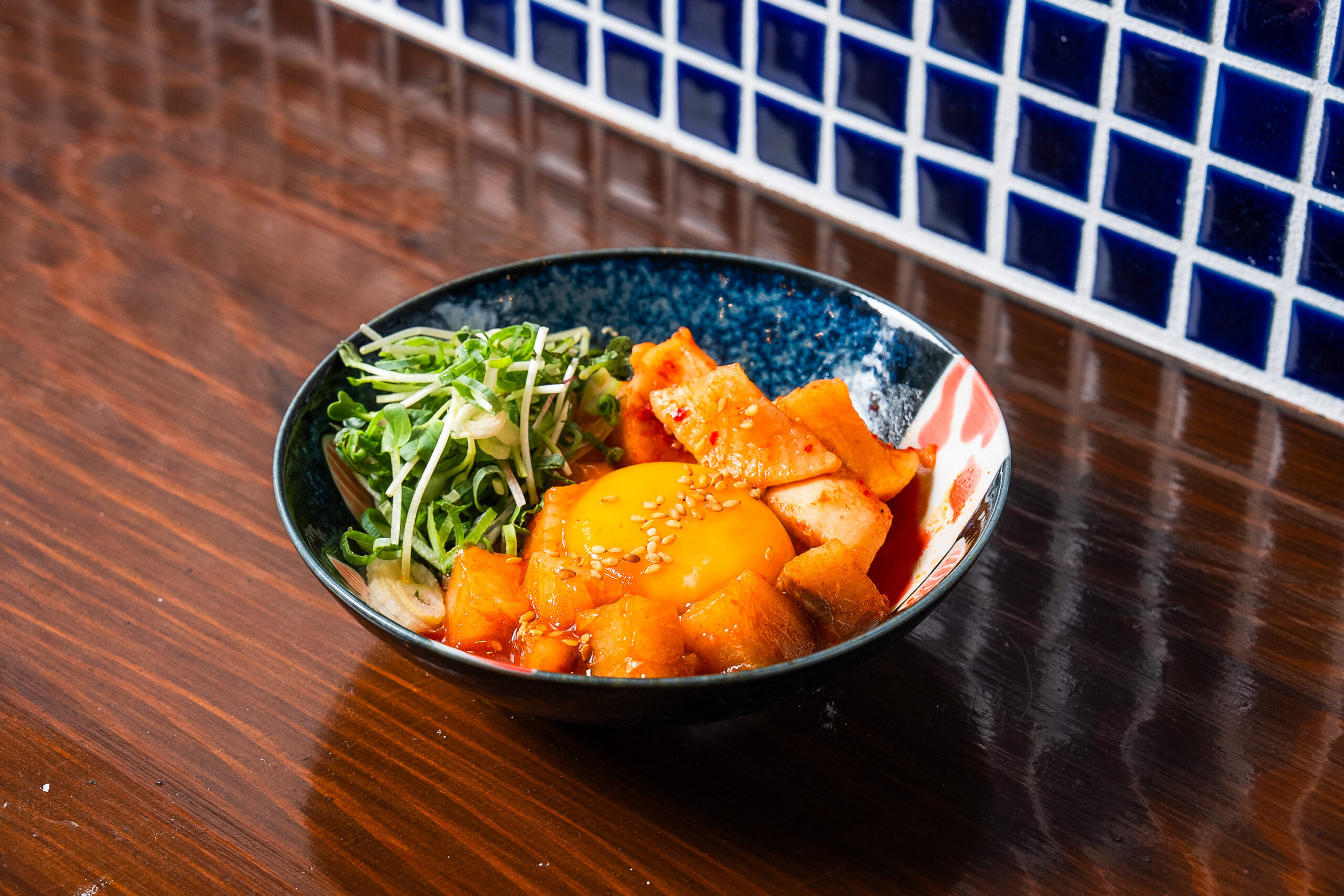 「お刺身ぶり大根ユッケ」は、脂がのった新鮮なぶりを特製のタレで和え、粗めにおろした大根と合わせた一皿は、さっぱりとしながらもしっかり旨みを感じられる逸品です。卵黄を絡めればまろやかさが加わり、ひと口ごとに味の表情が変わるのも楽しみのひとつ。