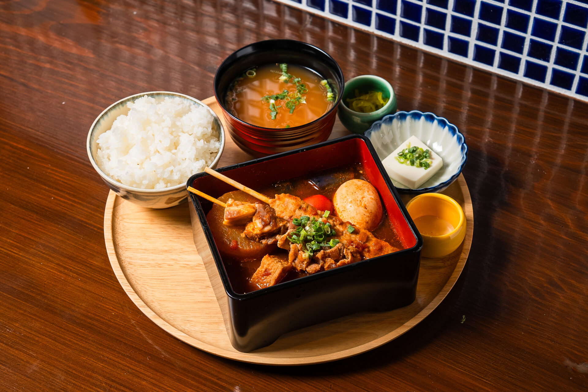 じっくり煮込まれた大根や玉子にデミの旨みが染みわたり、ご飯との相性も抜群。小鉢や味噌汁が添えられ、バランスよく満足感のある一食になっています。