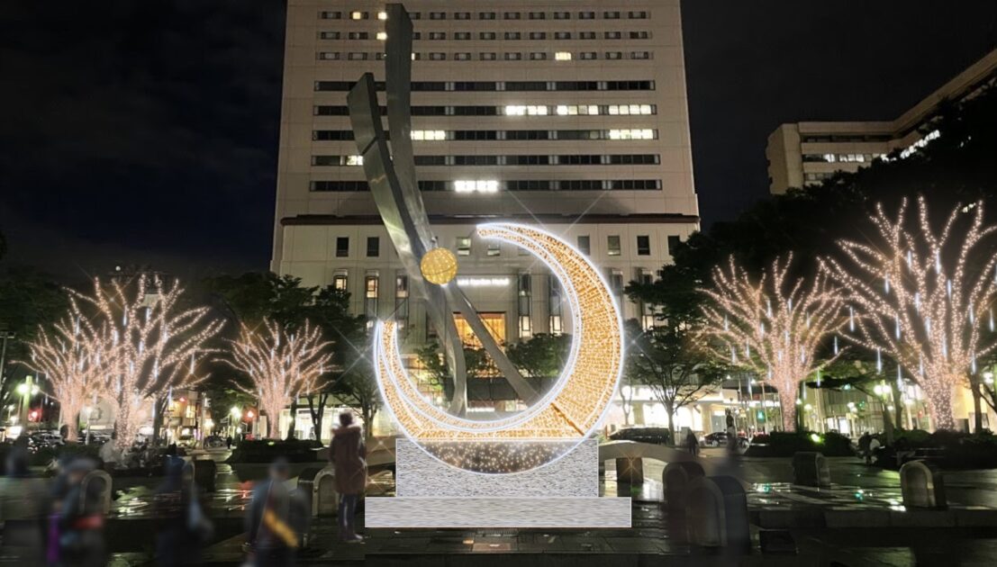 千葉市中央公園と千葉駅前大通りを、装飾と動きのあるスノーフォールライトや、アーチ型イルミネーションが彩ります。