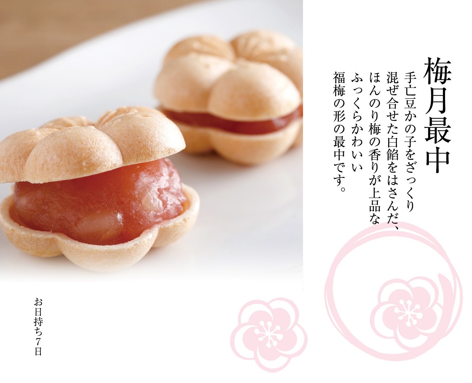 そして、もうひとつの人気者が看板商品の「梅月最中」。手芒豆かのこをざっくり混ぜ合せた白餡をはさんだ、ほんのり梅の香りが上品なふっくらかわいい福梅の形の最中です。