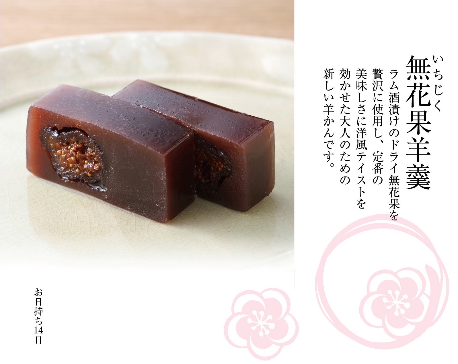 季節ごとのお菓子もまた、梅月庭の楽しみのひとつ。今が旬の「無花果洋かん」や秋が深まるこれからの季節には、ほっくりとした甘さの「芋羊かん」や、しっとりと蒸し上げた「栗蒸し羊かん」が登場します。