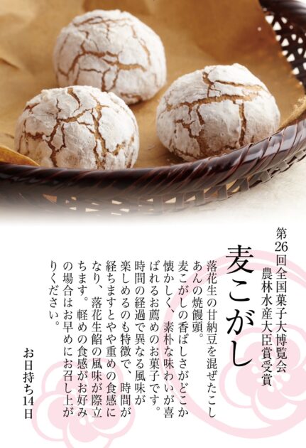 こちらで、まず味わいたいのが「麦こがし」。落花生の甘納豆を混ぜたこしあんの焼饅頭で、香ばしい風味がふんわりと口いっぱいに広がり、どこか懐かしさを感じさせてくれる逸品です。