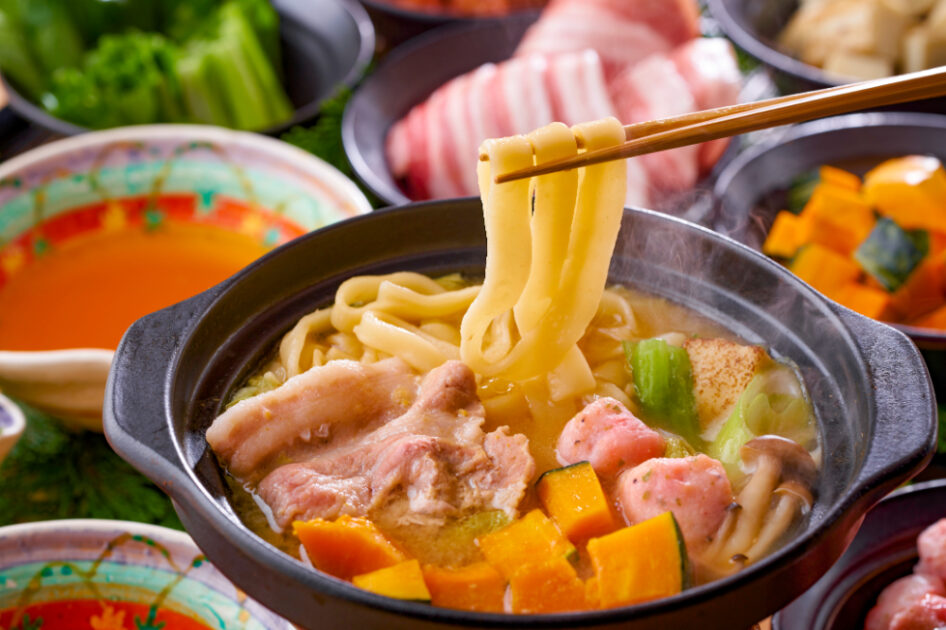 平らな「ほうとうめん」を、野菜などのたっぷり具材とともに煮込んだほうとうは、山梨県を代表する郷土料理。かぼちゃの甘みが溶け出したスープは、コクがありながらも優しい味わいで、心までも温まる!