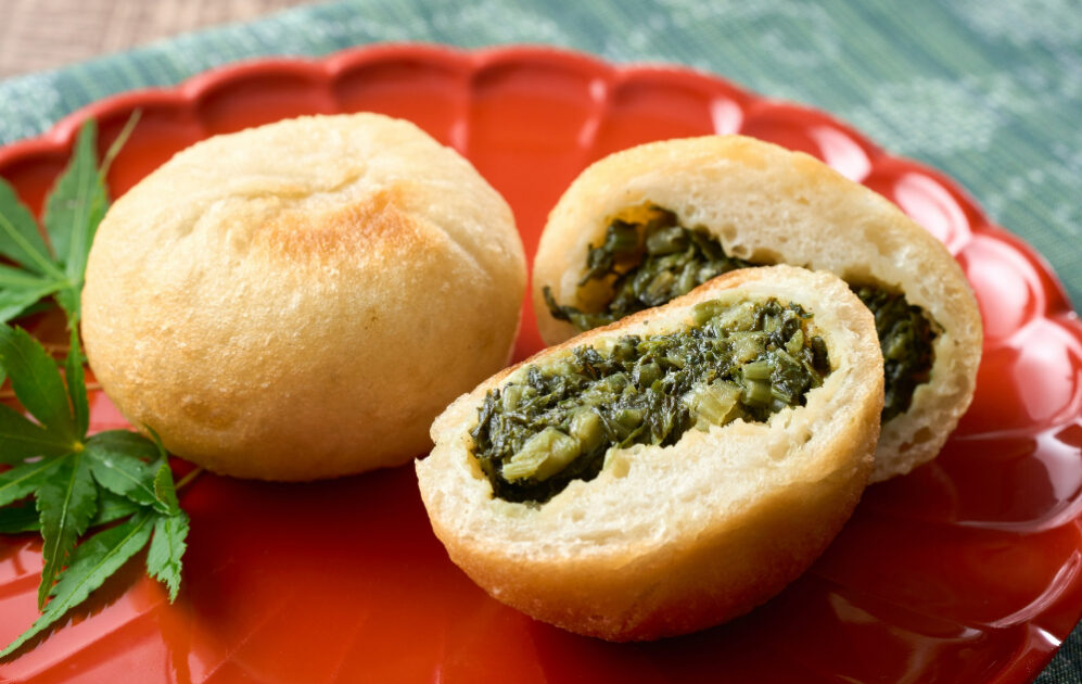 どこか懐かしく、心温まる味わいの長野名物「おやき」。数ある種類のなかから定番の「野沢菜おやき」を用意。もっちりとした皮とシャキシャキ食感の野沢菜が絶妙なおいしさ!