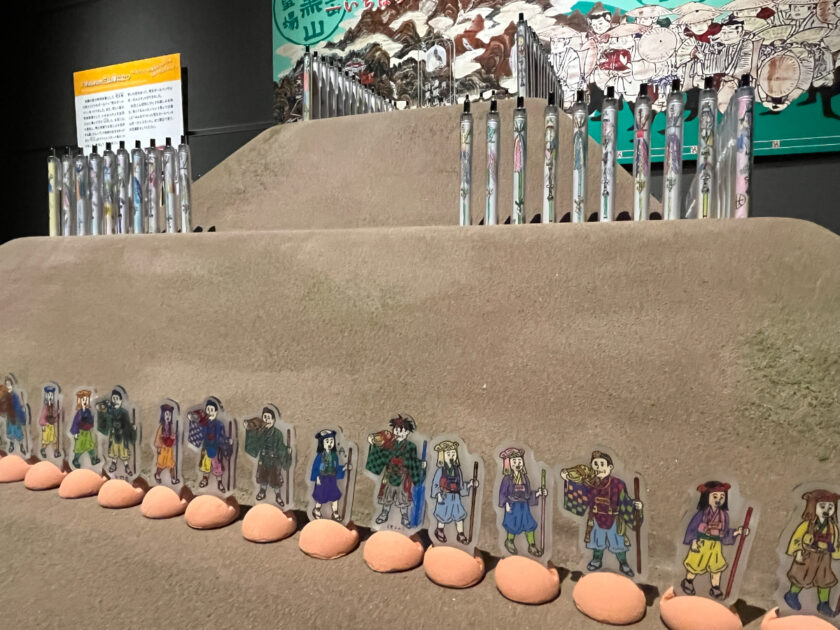 また、展示室内には、出羽三山供養塚を模した「I’Museum三山塚」のフォトスポットもある! 塚に並んだ「梵天ボールペン」とアクスタ風「山伏・行人スタンド」は、来館者と一緒に作製したもの。個性あふれる色とりどりの梵天ボールペンと山伏・行人スタンド。味わい深いこのフォトスポットで、一枚撮るのもアリですね!