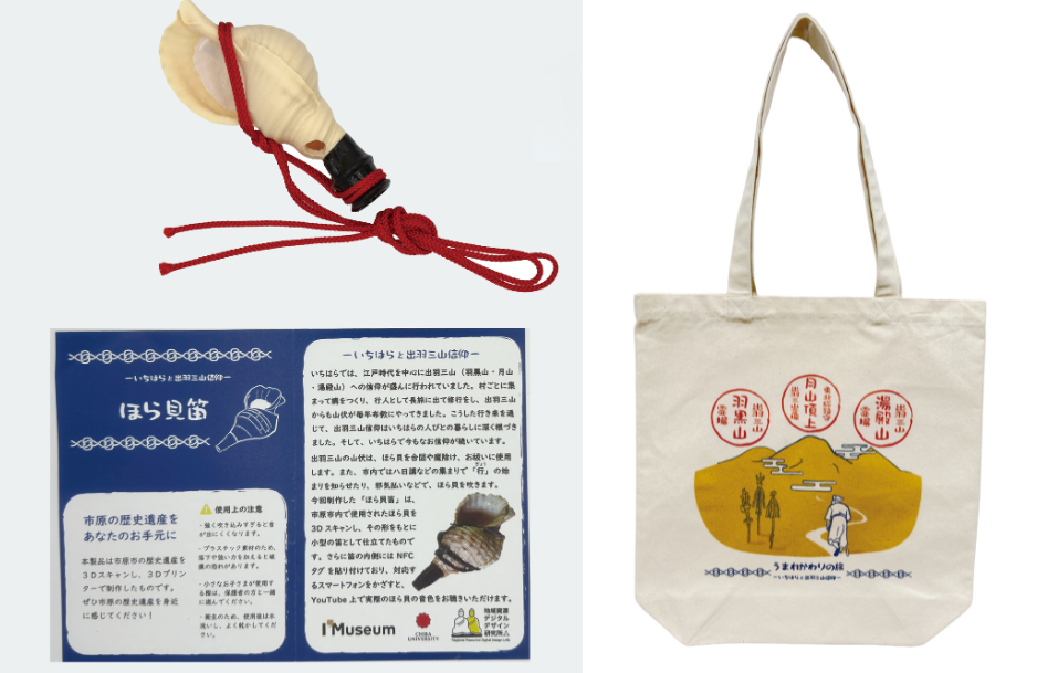 記念の限定グッズを購入できるのも、本展の特徴。千葉大学デザイン文化計画研究室とコラボした、ほら貝笛、参拝の旅手ぬぐい、行人トートバッグのほか、オリジナルスタンドミラー、クリアホルダーなど「うまれかわりの旅」展示の記念にもなるし、実用性もあるグッズばかり!