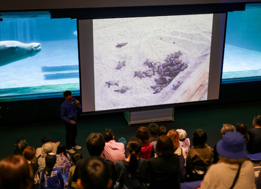 飼育員が保護活動をテーマにレクチャーを実施。滅多に聞けない話を通じ、水族館の活動について少し詳しくなれる時間を過ごせる。